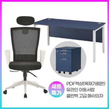 [세트특가]PDF책상(목재가림판)+유라인이동서랍+쿨린백고급의자(화이트)